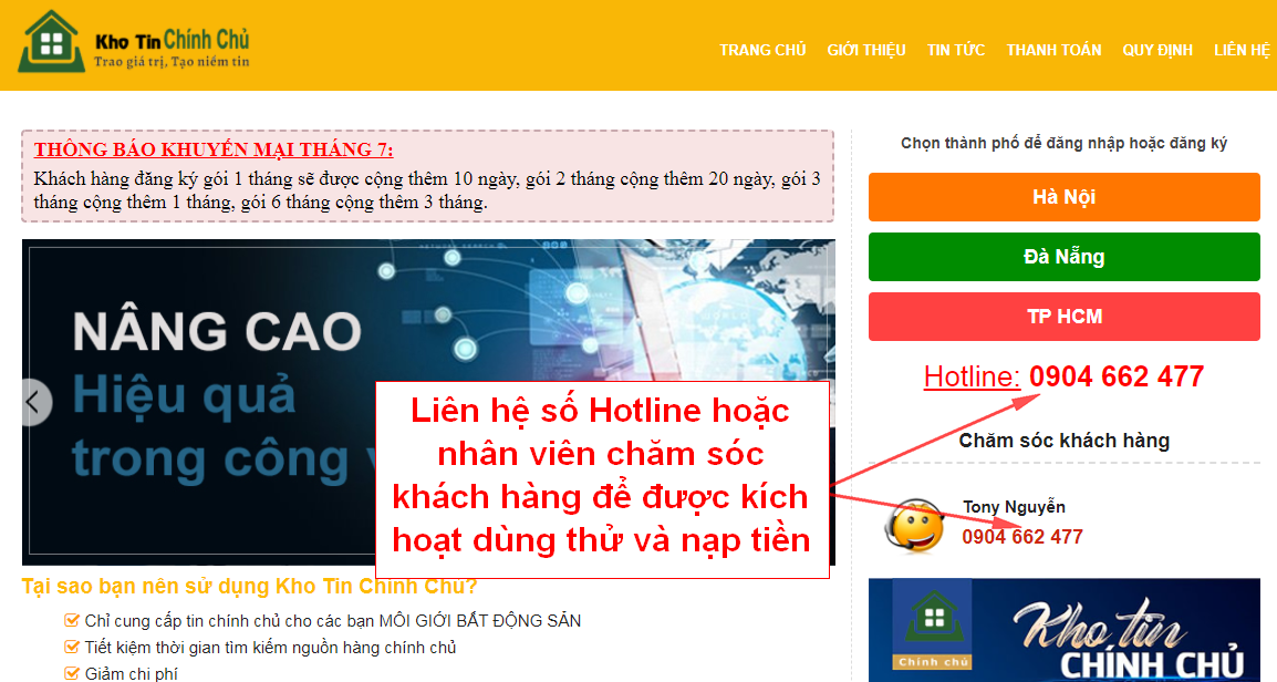 Sau khi đăng ký thành công Vui lòng liên hệ số Hotline hoặc nhân viên chăm sóc khách hàng để kích hoạt tài khoản và nạp tiền