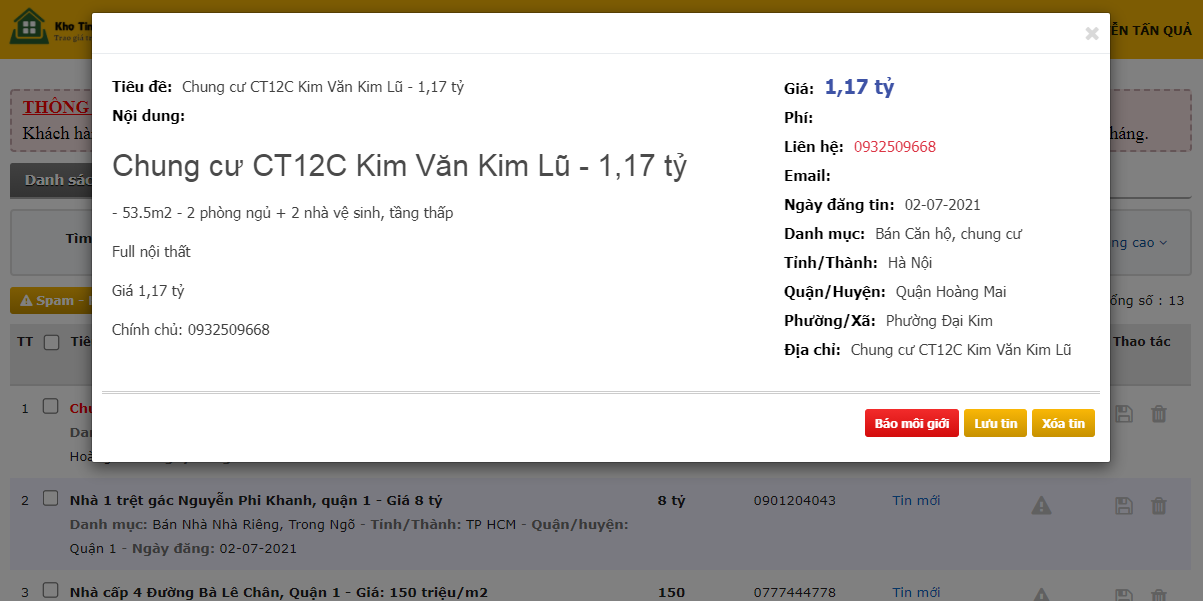 Xem và có một số nút lệnh báo cáo nếu tin đó là tin rác, Môi giới,...