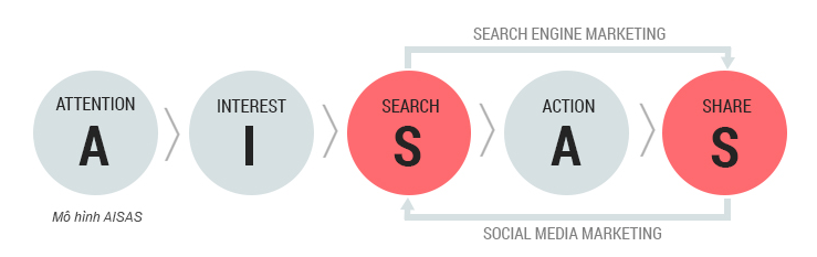 Search là 1 bước rất quan trọng. Nó đứng ngay giữa mô hình AISAS, trước Action và liên quan trực tiếp đến chữ S cuối cùng – Share. Đây cũng là bước chúng ta bắt buộc phải làm thật tốt, và nó cũng cạnh tranh rất dữ dội trong các môn có tên là SEO và Google Adwords.